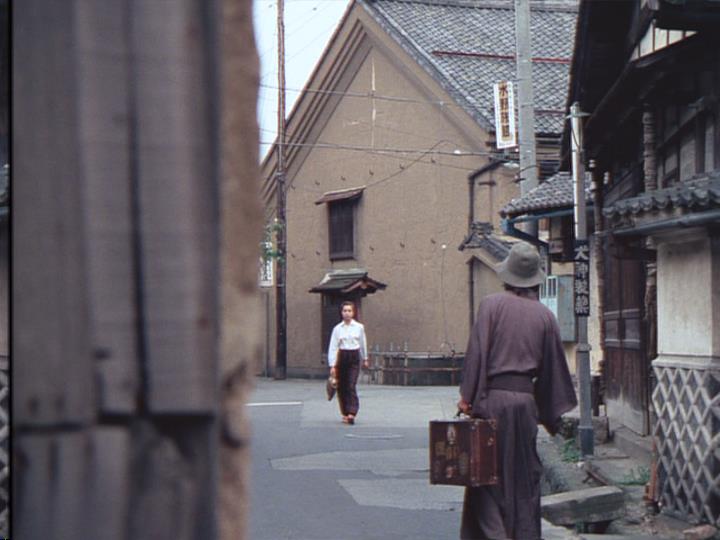 こういうところも何でもないシーンだけど、珠世の着物の赤紫と佐清(実は青沼静馬)の着物の濃紺色が対比を成している。間の松子夫人の着物は濃い紫で、ちょうど中間色ではないか。たぶんそこまで計算して着物の色を選んでるのだと思う。三人の背景にはちょうど無色の壁紙が来るようにしているのではないかと。