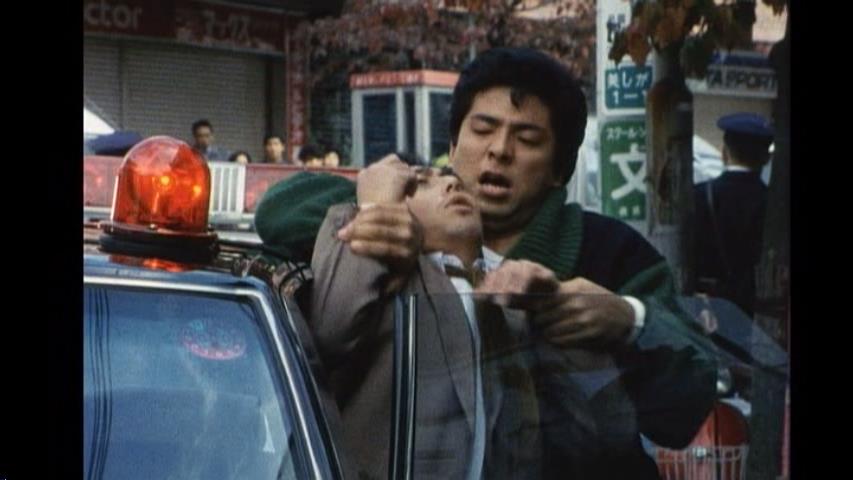 サラ金に強盗に入った覚せい剤中毒の男。取り押さえる松元刑事(小西博之)。電信柱に「美しが丘1-1」の表示が見える。ロケ地になったのは、たまプラーザ駅にほど近い「第一みなもとビル」。サラ金の事務所があった2階は、今は塾になっているみたい。